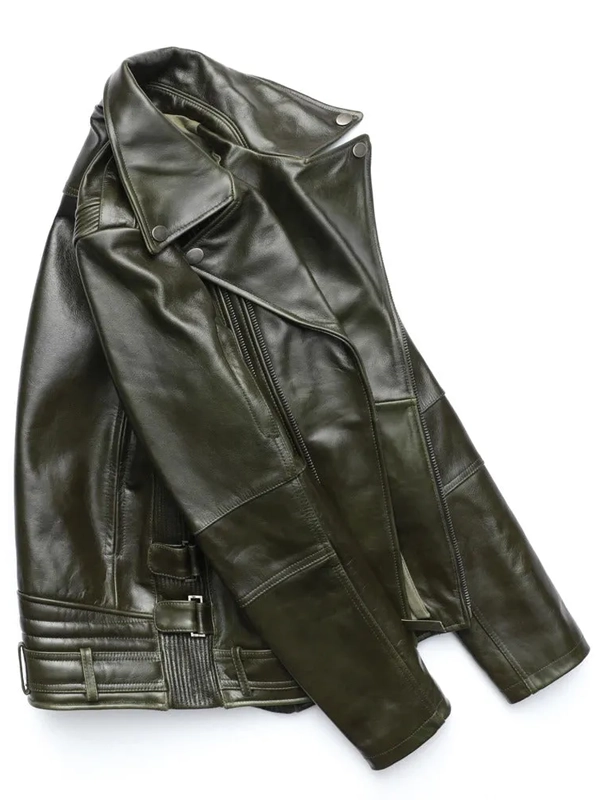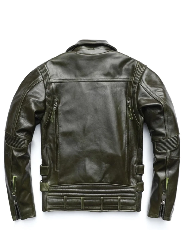 Men’s Army Green Cowhide Leather Motorcycle Jacket – Built for Style & Durability